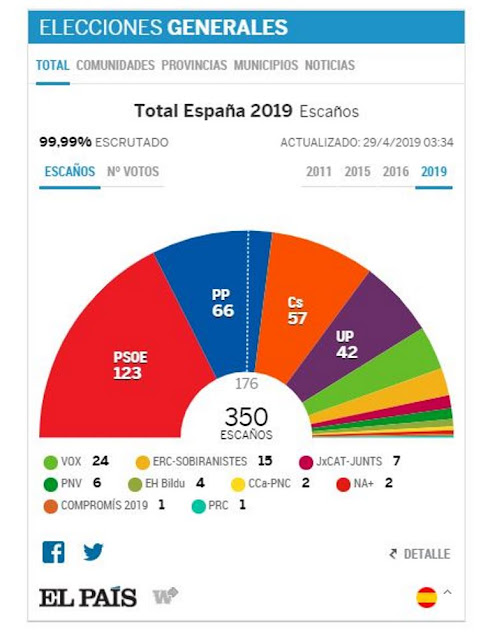 Com 7,5 milhões de votos [28,7% dos eleitores], o PSOE saiu vencedor das eleições gerais de ontem. Elegendo 123 deputados, foi o partido mais votado para o Congresso. E obteve maioria absoluta no Senado: 139 senadores. Aconselha-se Guronsan a quem antecipou a pasokização do partido de Sánchez.