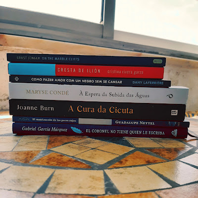 Dos comprados, chegaram Un jour ce sera vide, de Hugo Lindenberg, com a minha caixa de subscrição La Kube, La cresta de Ilión de Cristina Rivera Garza, El matrimonio de los peces rojos de Guadalupe Nettel e uma lindíssima edição ilustrada de El coronel no tiene quien le escriba, de Gabriel García Márquez, em seguimento do clube de leitura em espanhol da BLX; e ainda On the Marble Cliffs, de Ernst Junger, novidade da NYRB que me apelou.