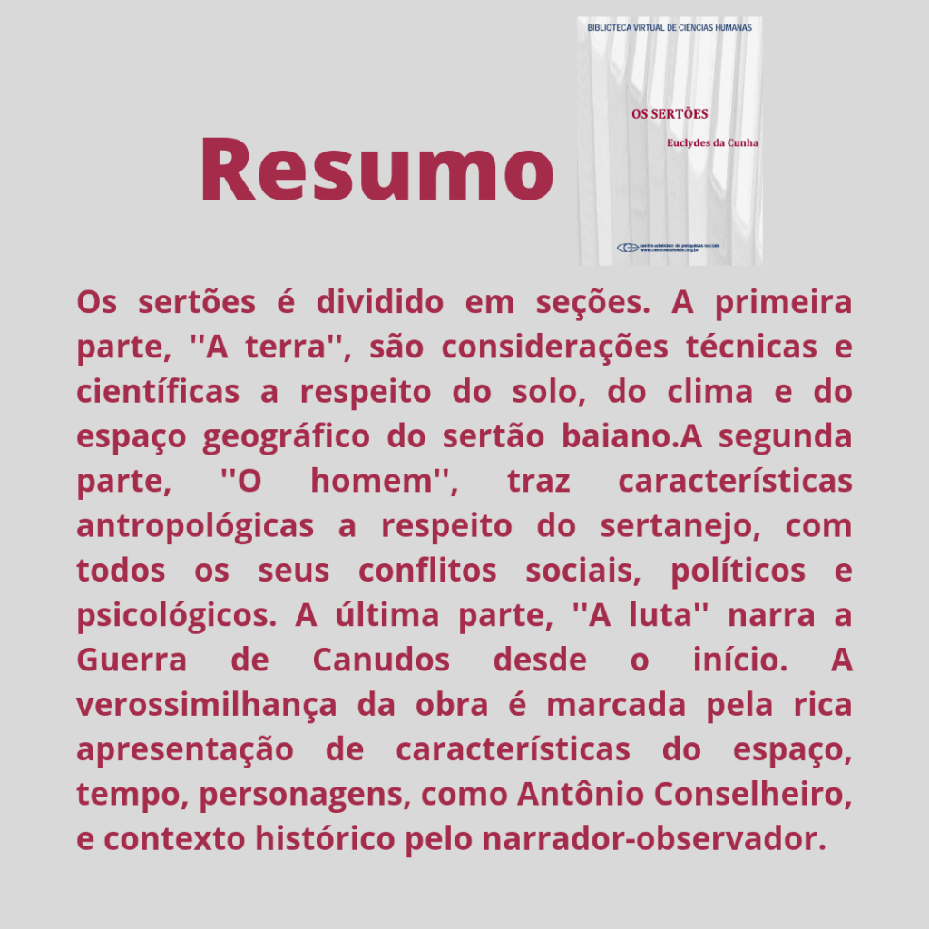 Complicado escrever sobre esse #livro. Precisei de uns dias. Sempre que leio um clássico, me sinto em um teste. Como leitora. Como se eu fosse obrigada a achar incrível. E às vezes, me frusto. Me culpo. Divido essa obra em três, assim como o autor. Mas com quesitos diferentes. A primeira parte, sobre a terra, abordando o solo, o clima, a vegetação, para apaixonados por geografia e biologia é ótimo, o que não é meu caso. A segunda parte é sobre o homem. E aí a coisa piora. Mesmo tendo em vista à época em que foi escrito, 1902, é impossível não se incomodar com o cunho racista, higienista e elitista do texto. Há citações vergonhosas sobre raça superior, sobre uma tese de miscigenação desejada pela população indígena e africana com a raça branca, como se fosse possível não perceber já naquele tempo de que mulheres indígenas e negras eram estupradas pelo homem branco. A terceira parte, a única que eu gostei, vai tratar a guerra de Canudos, que era meu intuito ao ler, revelando todas as etapas do desejo do governo em exterminar seu próprio povo, uma narrativa bastante informativa e elucidativa. Ainda que o autor tratasse a população do sul da Bahia como o inimigo e só tenha caído em si no final da escrita. Quem eram os bárbaros no final das contas?