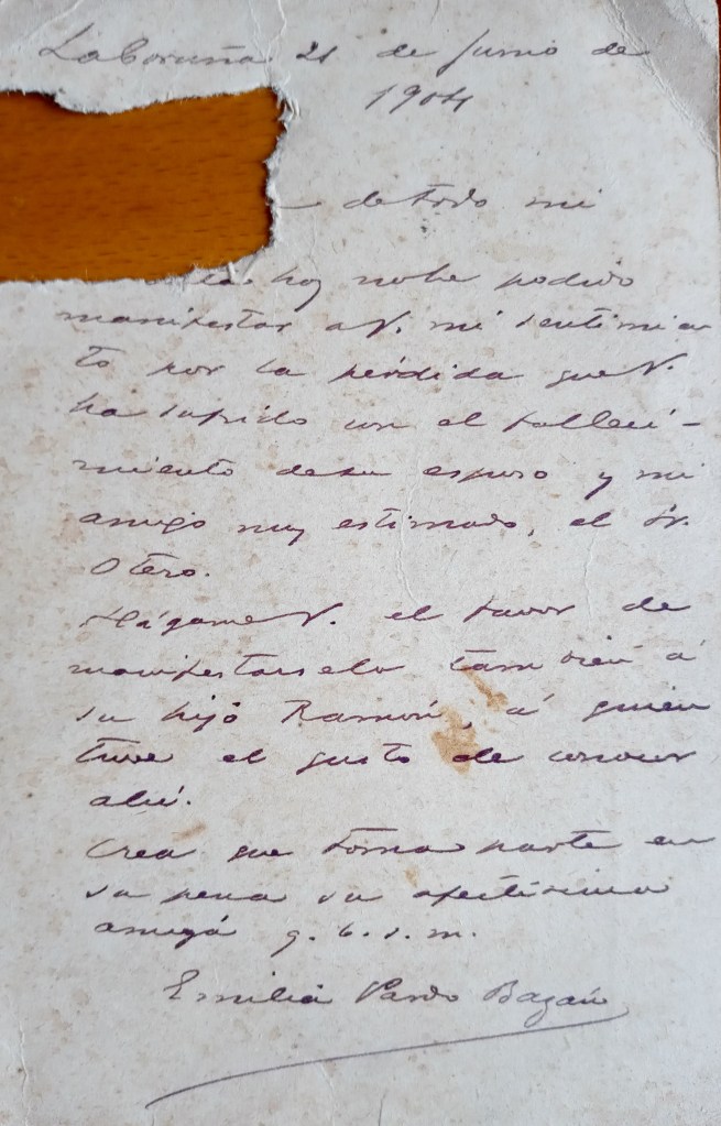 As liñas desta breve misiva desvela a relación de amizade que Pardo Bazán mantiña co médico ourensán e non esquece, alén de solidarizarse pola perda, manifestar un saúdo ao propio Ramón Otero Pedrayo, a quen confesa que coñeceu “ahí”, polo que é doado deducir que Emilia Pardo Bazán visitou, nalgunha ocasión, a casa ourensá dos Otero, ou talvez Trasalba. Como se pode apreciar, o documento está danado no lugar destinado ao selo, que desapareceu levando cando si parte da fórmula de saúdo, mais conserva o texto da escritora coruñesa que se reproduce aquí: