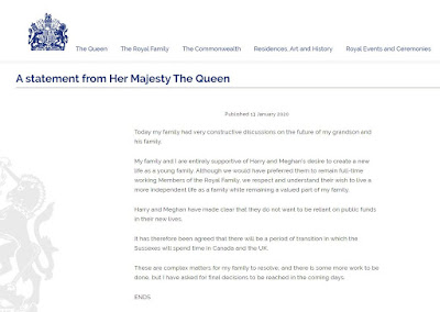 «Hoje, a minha família teve discussões muito construtivas sobre o futuro de meu neto e da sua família. A minha família e eu apoiamos totalmente o desejo de Harry e Meghan de criar uma nova vida [...] Embora tivéssemos preferido que continuassem a trabalhar como membros da Família Real a tempo inteiro, respeitamos e entendemos o desejo de viver uma vida mais independente [...] Harry e Meghan deixaram claro que não querem depender de fundos públicos [...] São assuntos complexos para a minha família resolver e há mais trabalho a fazer, mas solicitei que as decisões finais fossem tomadas nos próximos dias