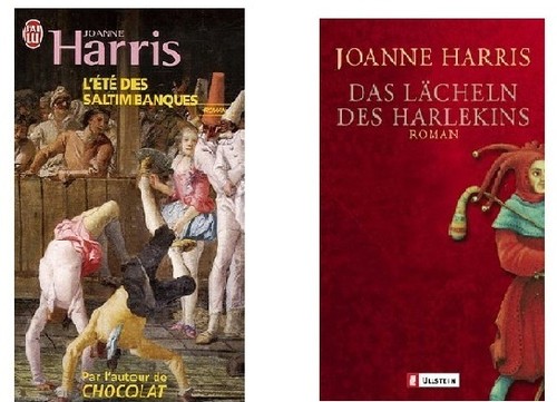 Gosto da imagem escolhida para a edição francesa, com as várias personagens do teatro e o público. Só tirava aquele "pela autora de Chocolate" do meio dos braços do homenzinho...A edição alemã é mais atractiva, mas não gosto muito. Cortaram o arlequim e deixaram uma mancha enorme de vermelho sem nada.