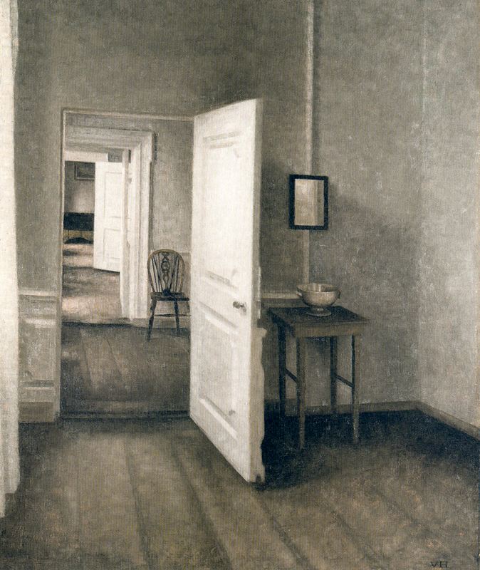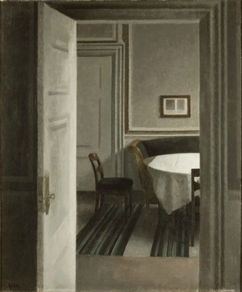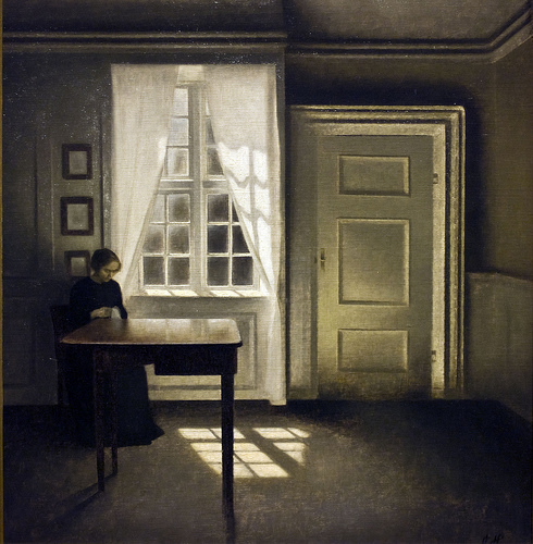 [1] Sem querer fazer um levantamento exaustivo, temos—além de Joyce e Beckett, alguns bastante famosos (Borges, Pessoa, Nabokov, Oscar Wilde, Italo Calvino, Marguerite Duras, Cortázar, Melville, Paul Auster, Antonin Artaud, Dylan Thomas, Nietzsche, Yeats, Proust Emily Dickinson), outros nem tanto (Hugo Claus, Claudio Magris, W. G. Sebald, Julien Gracq, Robert Walser, Georges Perec, Carlo Emilio Gadda Maurice Blanchot,, Jules Renard, Flann O´Brien, Siri Hustvedt, Mark Strand, Roberto Bolaño, Julian Barnes, Perer Handke, John Banville), outros bem mais para desconhecidos (Mark Strand, Idea Vilariño, Augusto Monterosso, José Emilio Pacheco, Claire Keegan,Joseph O´Neill, o grande tradutor J. Salas Subirat , Brendan Behan, Colum McCann), e outros que são citados e que não achei no tão amado Google de Riba (Larry O´Sullivan, Andrew Breen, Hobbs Derek, Vilém Vok);além dos escritores, temos os cineastas David Cronenberg (e seu filme Spider), Charles Walters (High Society), Antonioni (O deserto vermelho), John Ford, a atriz Catherine Deneuve, entre outros; também os músicos Tom Waits, Bob Dylan, Johnny Cash, a cantora Billie Holliday; temos o pintor Vilhelm Hammershoi (ver quadros abaixo), a criadora de instalações Dominique Gonzales-Foerster. E há as referências constantes à Marshall McLuhan e sua “Galáxia de Gutenberg” e ao “Teatro de Oklahoma”, que evidentemente nos evoca Kafka (de Amerika ou O Desaparecido, onde no entanto é grafado como Teatro de Oklahama).