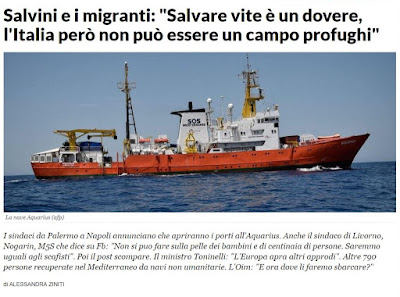 Pela boca de Matteo Salvini, vice-presidente do Governo, a Itália proibiu a entrada do navio Aquarius nas suas águas territoriais. A bordo estão 629 imigrantes africanos, sendo 123 menores desacompanhados, onze crianças e sete mulheres grávidas. Luigi Di Maio, o outro vice-presidente, líder do 5 Stelle, tentou matizar a decisão, mas Salvini, líder da Liga, o partido de extrema-direita que integra a coligação, é para todos os efeitos o chefe do Governo. Giuseppe Conte, o tecnocrata que bateu com a porta mas depois voltou, chefia o Governo para UE ver (não esquecer que foi escolhido e imposto pela Liga). Salvini argumenta que a Itália não tem que aceitar o que Malta, a Espanha e a França não aceitam. A decisão não surpreende. As autoridades de Palermo, capital da Sicília, bem como as de Nápoles, estariam dispostas a receber o Aquarius, mas a Guarda Costeira já fez saber que cumpre ordens de Roma e apenas de Roma.