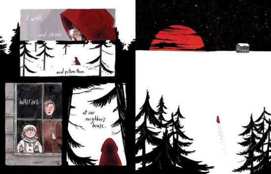 E, então, numa manhã de sábado, a escolha de leitura recaiu sobre Through the Woods, de Emily Carroll, sobre o qual já tinha lido maravilhas, mas do qual pouco sabia. Trata-se de uma colecção de short stories que se passam em zonas mais recônditas, meio rurais, com a floresta como quase pano de fundo. Histórias de terror, em tons predominantemente a preto e branco com toques de vermelho a estabelecer o tom da narrativa. Em formato digital, as cores têm amplo destaque.