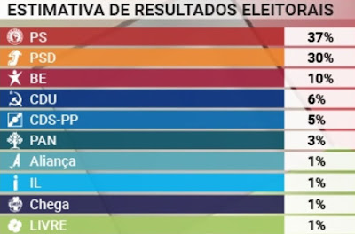 PS = 37% / PSD = 30% / BE = 10% / CDU = 6% / CDS = 5% / PAN = 3%