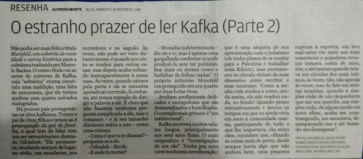 Não podia ser mais feliz o título “BLUMFELD, UM SOLTEIRÃO DE MAIS IDADE E OUTRAS HISTÓRIAS” para a coletânea traduzida por Marcelo Backes. O conto-título vai ao cerne do universo de Kafka, cuja “solteirice” eterna constituiu uma maldição, uma falta de autonomia, que ele tentou quebrar com quatro noivados malogrados.
