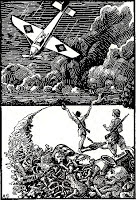 Esta é a imagem que me ficou do livro A Filha do Inca de Menotti del Picchia, uma tentativa de fazer literatura “julioverniana” no Brasil em 1930. Tentativa bem-sucedida, pois o livro está em catálogo até hoje, e em 1950 teve uma edição francesa pela Albin Michel, “La République 3000”. No decorrer do romance, ficamos sabendo que ali existia uma cidade futurista, oculta no Brasil Central, e “aquela barreira de esqueletos era uma misteriosa barreira elétrica, riscada no coração do sertão brasileiro por mãos invisíveis e prodigiosas.” Ou seja: há milhares de anos que animais aproximavam-se daquele ponto da campina e eram eletrocutados pelo campo de força invisível, tombando ali mesmo.