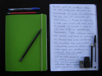 O lápis 2B me força a me concentrar, a não me perder com a possível profusão de palavras, inteligíveis ou não, que escrever com oito dedos (mais digitando do que datilografando) podem proporcionar. Embora já tenha em mente, quando me sento à mesa e abro o caderno de notas, um — perdoe a redundância — esboço etéreo do que quero escrever, tenho de me concentrar para evitar que as explosões de imagens, ideias e sensações em minha mente destruam minha concentração. Só tenho um dedo para transcrevê-las. Um dedo primitivo.