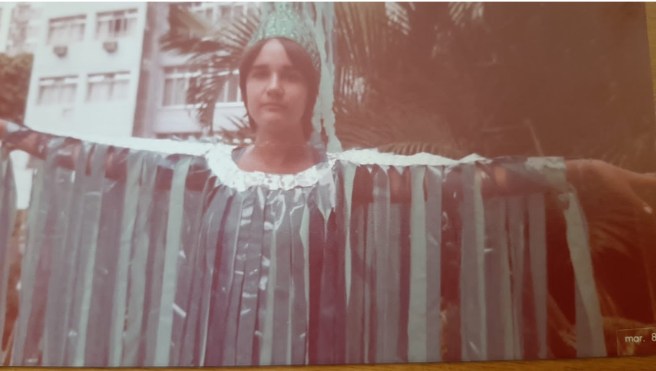 O desfile acontecia na Marquês de Sapucaí (Mas ainda não existia o sambódromo. Ele foi criado em 1984. E eu estava lá também, mas nesse ano, pela Caprichoso de Pilares). Eram arquibancadas móveis, instaladas e desinstaladas a cada Carnaval. E eu entrei naquela avenida fantasiada de mar, ao lado do carro abre-alas, com um longo collant até o tornozelo e um monte de fitas de plástico em diversos tons de azul, que caíam do ombro até os pés. Conforme balançávamos os braços, formávamos as ondas que embalavam a Ilha e toda a arquibancada. Foi lindo! Tudo bem que minha mãe, em sua cruel e cotidiana sinceridade, olhou para mim e disse categórica: “filha, você está parecendo é uma cortina de banheiro!!!” Essa era dona Lucinda. Que saudade dessa verdade rasgada…