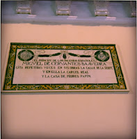 Rumámos, portanto, à Casa del Libro. Passámos na Calle Sierpes, que tem uma placa comemorando o facto de muita da obra de Miguel de Cervantes se passar lá. Já agora, alguém que tenha lido Don Quijote: passa-se em Sevilha? Há tantas referências em lojas de recuerdos! Mas regressando à Calle Sierpes: a Librería San Pablo, uma livraria católica, com secções dedicadas a cada um dos últimos três papas. Infelizmente, a livraria fechava cedo (para os padrões da cidade), e não pudemos explorar muito.