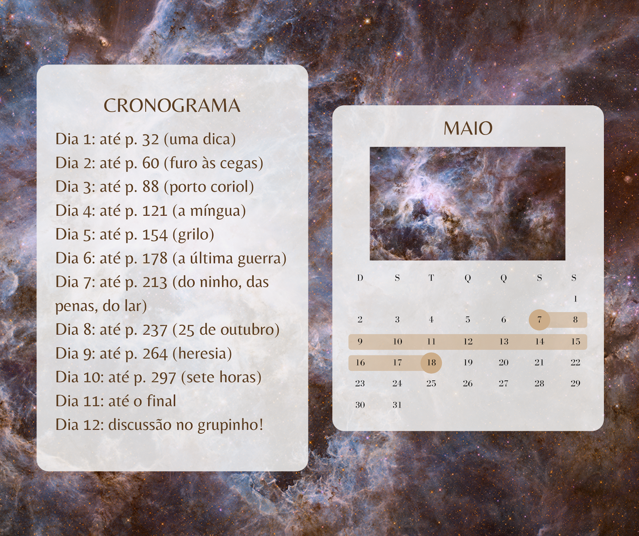 Nossa leitura vai começar no dia 07/05 e vai até o dia 18/05. O cronograma de páginas/capítulos a serem lidos por dia vocês podem conferir abaixo. Tentamos separar uma quantidade ok de páginas por dia para dar tempo de todo mundo participar com tranquilidade!