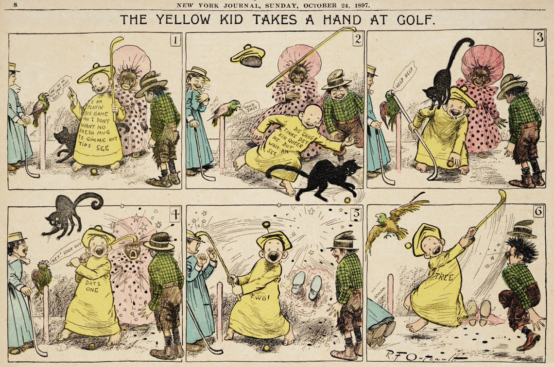 Yellow Kid, de Richard Felton Outcault, começou a circular em 1895 com balões de fala em vez de legendas para cada cena, como no BrasilOhio State University