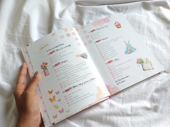 O livro é dividido em seis partes: Moças do Século XXI; Inspira; Moda, beleza, pesos e medidas; DIY e outras dicas; Viajando; Listas. Ao ver essa organização toda cronológica e coesa, não pude deixar de imaginar a Mel colocando cada coisinha no seu lugar.