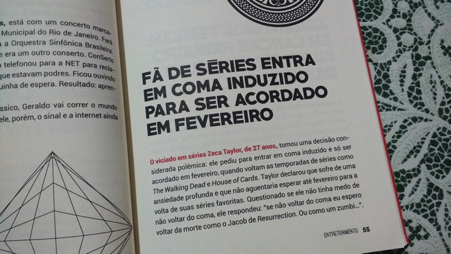 Não é o tipo de leitura que não está na minha zona de conforto, mas confesso que me diverti bastante lendo, principalmente as chamadas mesmo das manchetes. Apesar de ter sido uma leitura proveitosa, não acho que é o tipo de livro que a gente deve ler numa sentada, pois acaba ficando um pouco cansativo.