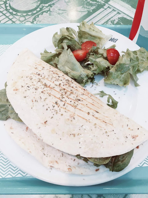 Companhia: Numa segunda-feira à noite, depois de fazermos as compras para a casa, decidimos jantar no Parque Nascente. Como queria uma refeição mais rápida e leve, fui à Companhia e arrisquei na Piadina de Frango, Bacon, Abacate e Queijo. Este wrap estava ótimo, bem servido e veio acompanhado por salada. Para beber escolhi limonada com hortelã e deliciei-me. Foi das melhores que já provei.