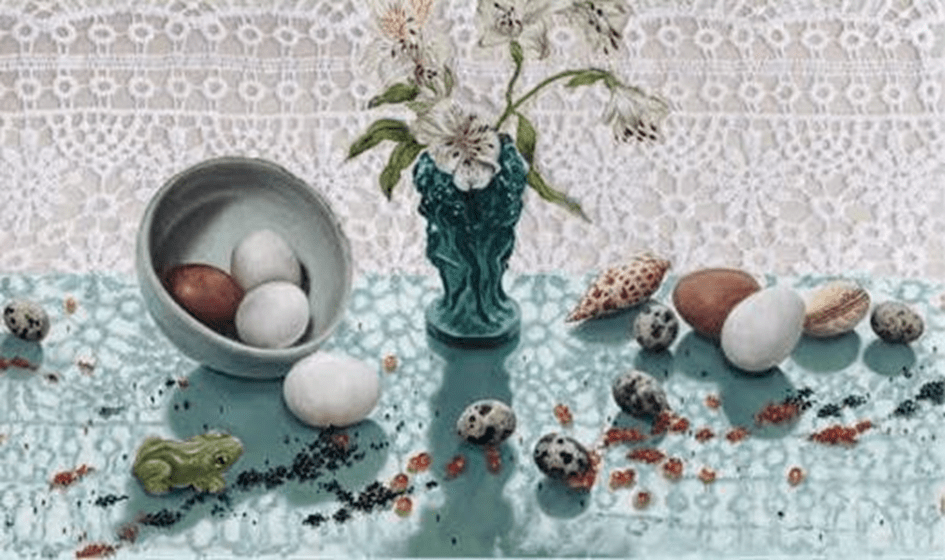Créditos da imagem: Ana Elisa Egreja. Natureza morta com ovos, 2023. Obra de arte concebida especialmente para a capa do livro As pequenas chances.