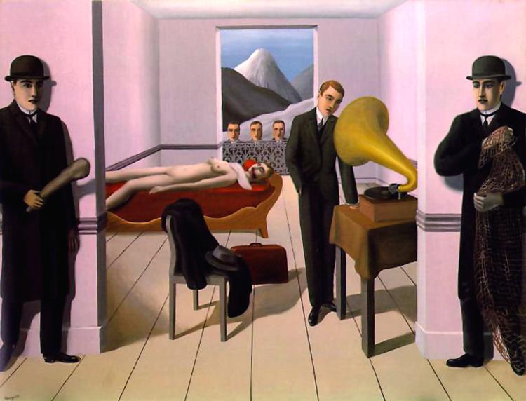 O grande obstáculo para o artigo era não entender o que estava na imagem. Era um crítico de arte de renome, e a simples existência de uma obra que não cedia diante das suas investidas interpretativas era singular. O assassino acabou de cometer o crime: todos sabiam que ele era o responsável, e vários olhos seguiam os seus movimentos. O próprio espectador acompanhava os passos sorrateiros. Ele estava de costas para a mulher assassinada, aparentando interesse pelo gramofone. Ao lado da porta, dois homens esperavam para entrar no quarto, um deles portando um porrete, o outro uma rede. Na janela, mais três desconhecidos de chapéu mantinham-se atentos, em uma atitude quase voyeur. O homem permanecia sob vigilância, mas não ameaçado. A sua calma contrastava com o ambiente repleto de tensão. Ele não agia como alguém culpado e sequer parecia com um, pois qual é o bandido que retira o casaco e o chapéu antes de cometer um crime? A semelhança dos traços fisionômicos do assassino com os guardas que estavam prestes a capturá-lo era outro ingrediente contraditório, pois dava a sensação de que todos ali se confundiam, flagrados em meio a um crime confuso.