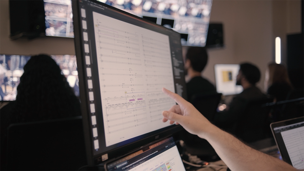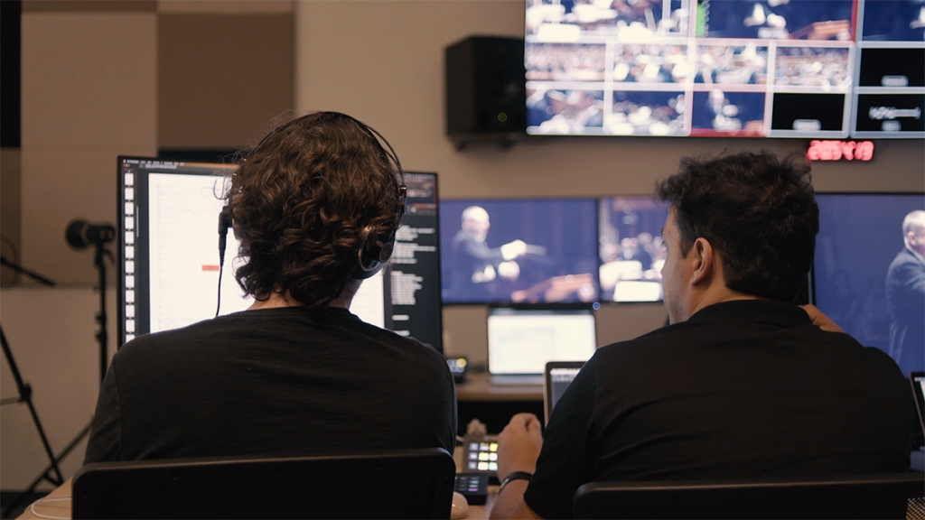 Quinta-feira, 10h20. É uma fria manhã e Carol Baliviera está sentada em sua mesa, que fica numa posição de observação privilegiada do estúdio de transmissões da Osesp. Estamos na Sala Almeida Prado, à direita de quem entra na Sala São Paulo, logo depois das catracas. Como supervisora de Audiovisual da Fundação Osesp, Carol comanda a equipe que no momento acompanha o ensaio da orquestra em seus monitores. Na “regência” das câmeras, o maestro Fábio Scucuglia, assistido pelos também maestros Guilherme Schewnk e Cadu Byington. No som, o produtor de áudio Guilherme Triginelli. Fábio define e confere as marcações das câmeras remotas instaladas na sala de concerto, tarefa essencial para a transmissão ao vivo do concerto da noite seguinte, sexta-feira.