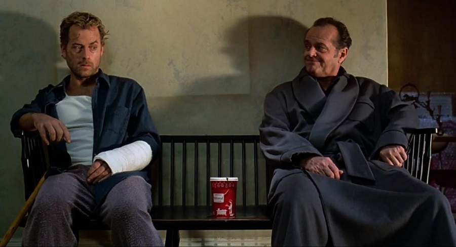 Melvin repensa – o que ele faz, o que ele diz. O que ele é. Tudo vem da frase imunda largada a Carol sobre o filho dela, cuja saúde ele sabe que está debilitada: e é esse plano que aguardava Brooks, o olhar de surpresa ferido de Helen Hunt face à face, Nicholson ocupado com a disposição simétrica de seus talheres de plástico, que levanta finalmente o olhar. Ele vê ela o olhando. Seu olhar. O plano em sua duração mostra com isso como ele repensa e como pela primeira vez ele acede a um clarão de consciência. Esse foi o início de uma longa convalescença, ao final da qual, à força de caretas e de esforços frustrados, Melvin recompensará o que ele havia lamentavelmente estragado, perdido e arrotado: desajeitadamente e pausadamente, não há outra maneira e ele não a cortaria, Melvin passará pelo ridículo, pelo enternecimento e pelo sentimentalismo – como todo mundo. Ele retornará na hora de comprar paletó e gravata em um longo desvio do restaurante, cena que é ainda mais magnífica por ser dispensável (dramaticamente, e essencial ao tempo de consciência impresso pelo filme), para conseguir finalmente fazer um elogio àquela que, no seu lindo vestido vermelho, espera. Para os sons of a bitch também existe uma saída, sim, uma recuperação possível, amorosa ou artística – o que em uma comédia romântica representa aproximadamente o mesmo. Essa é uma das melhores razões para rever em 2018 esse filme divertido e doloroso, esse belo filme vinte anos depois e idêntico. To be a better man.