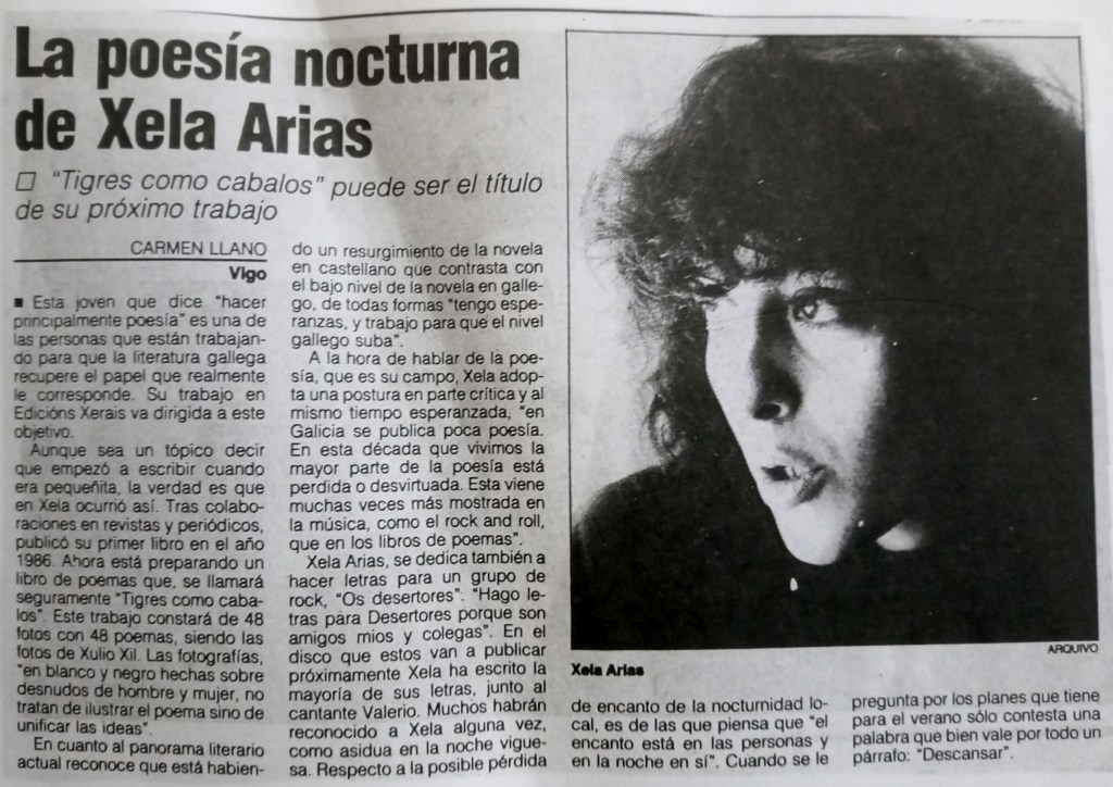 Ultimo estes días un traballo sobre a recepción de Tigres coma cabalos de Xela Arias e Xulio Gil, isto é, sobre cal foi o enfoque que posuía o proxecto desde as instancias autoriais e como foi o proceso de recepción nos medios escritos. A primeira referencia que probablemente haxa a este libro é unha entrevista que lle outorga á xornalista Carmen Llano, do Atlántico Diario, e que viu a luz o oito de xullo de 1989. Sospeito, daquela, que o libro formaría parte xa do plan de edición de Edicións Xerais de Galicia para o ano seguinte.