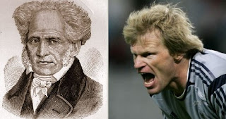 Falando de figuraças, avistei de novo a cara de Oliver Kahn, o goleiro alemão campeão da antipatia. Na transmissão de Alemanha 2x0 Suécia, a câmara o mostrou no banco de reservas, o grupo todo vibrando com os gols e ele “de bode amarrado” porque ficou na reserva. Dias atrás, folheando um livro de filosofia, descobri por que ele é assim. Kahn é a cara, escrita e escarrada (só que com cabelo menos revolto), do filósofo Schopenhauer, autor de O Mundo como Vontade e Representação. Schopenhauer, em seus momentos mais pessimistas, via a existência humana como um processo sem sentido, marcado pela irrelevância e pelo sofrimento. Se a Teoria das Vidas Passadas é verdadeira, o sombrio filósofo reencarnou para comprovar essa tese em 2002, diante do pés de Ronaldo. A seleção alemã passou o rodo em todo mundo até agora, mas esperemos que pelo menos esta parte final da História se repita.