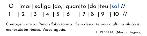 O verso acima apresenta coincidência total de sílabas poéticas e gramaticais já que a última palavra é monossílabo tônico (verso agudo). Mas esta coincidência é rara porque outros elementos contam na Versificação.