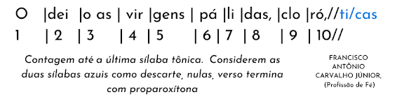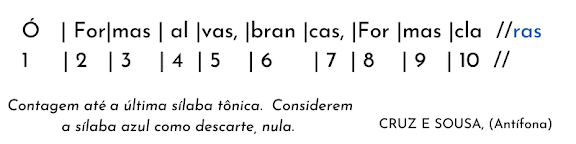 Verso que finaliza com palavra proparoxítona se chama esdrúxulo e nele duas sílabas serão jogadas fora. Observem que neste próximo caso há 13 sílabas gramaticais, mas 10 poéticas. Além da contagem francesa, há outro fenômeno que veremos na seguinte seção.