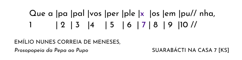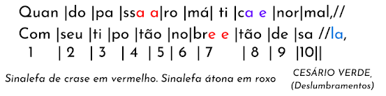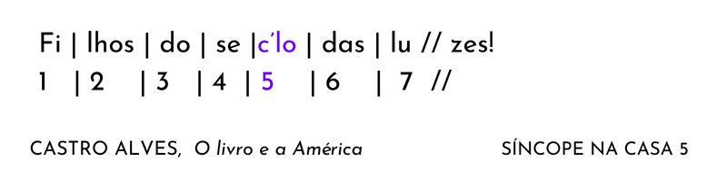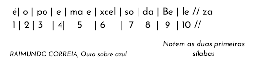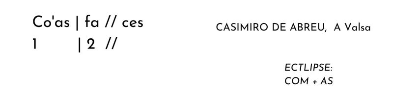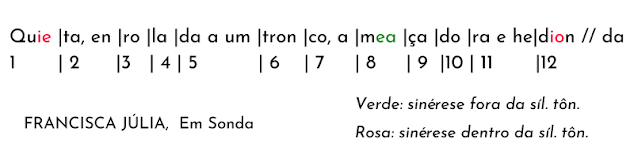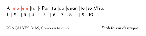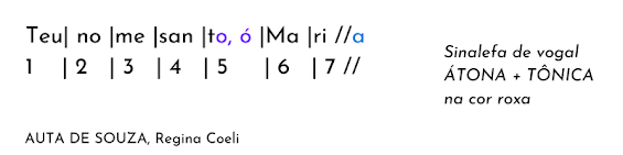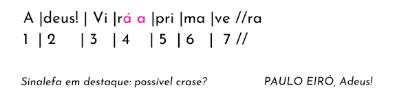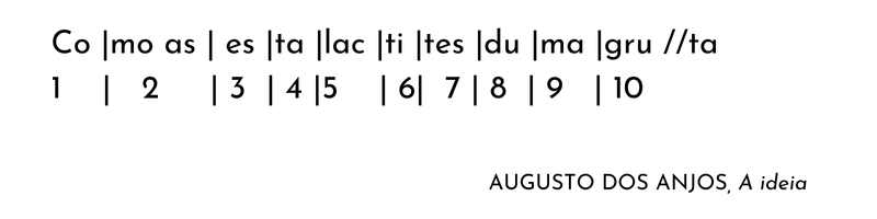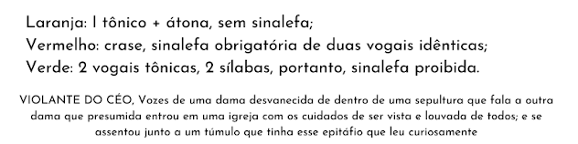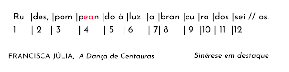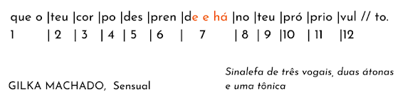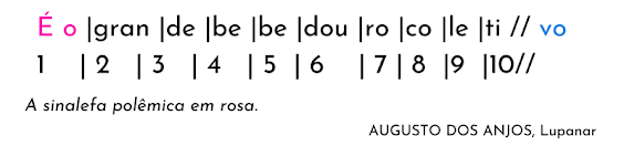 Os dois versos possuem 10 sílabas poéticas, mas 12 gramaticais. As sílabas removidas ou acopladas a outras são chamadas de “intrusas” por Duque Estrada (1914: p. 54). Nestes versos do poeta mineiro temos apenas casos em que todas as vogais da sinalefa são átonas. Mas há os casos em que temos átona + tônica onde a sinalefa também ocorre.