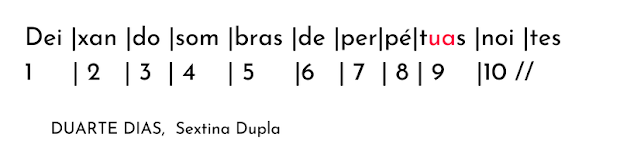 De um modo geral, U é som vocálico que se destaca bastante. No caso da sextina dupla de Duarte Dias, temos o adjetivo perpétuas. Há um imenso debate na gramática se essa palavra é paroxítona (per-pé-tuas) ou proparoxítona (per-pé-tu-as). Mesmo que a consideremos proparoxítona, o autor optou pela sinérese, perfeitamente legal, uma vez que a tônica está na sílaba anterior favorecendo a aceleração da sílaba posterior e átona.