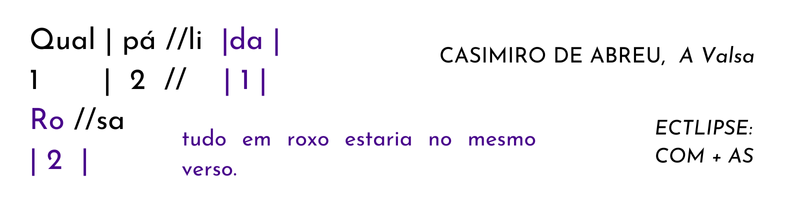 A palavra grega synapheia é cognata da palavra sinalefa. Em termos práticos, o que aconteceu acima foi a junção em crase das vogais AA. LA + A. Mas abaixo temos sinafia por adição. Considerando que o poema A Valsa é composto por versos dissílabos, tudo em roxo abaixo pertence ao segundo verso: