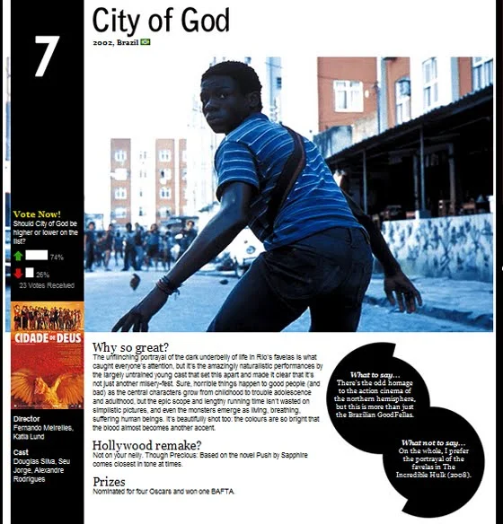 Um detalhe interessante é os leitores podem votar se o filme merece estar abaixo ou acima da posição atual. Não sei se eles vão alterar a lista de acordo com isso, mas seria legal ver Cidade de Deus subindo cada vez mais!