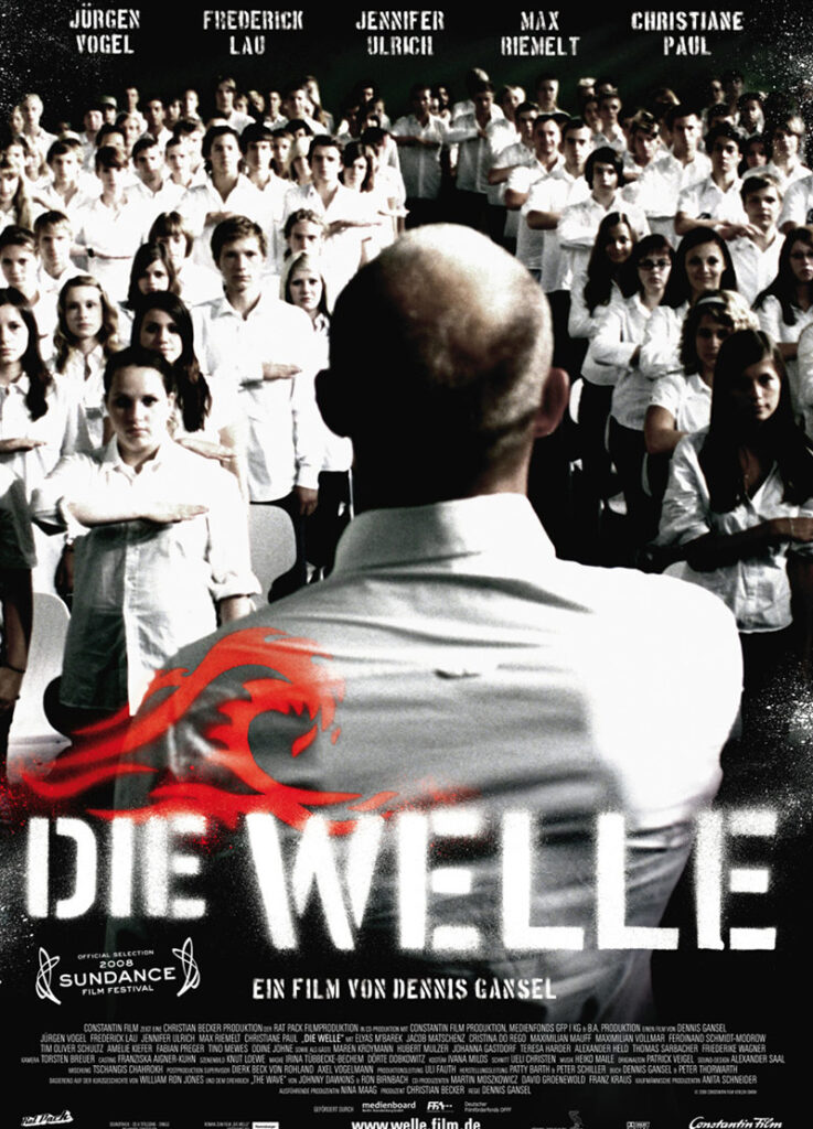 Herr Wenger lembra, com as mesmas dez letrinhas divididas em quatro e seis, a nauseante saudação nazista Heil Hitler. O filme de Gansel baseia-se num experimento real de um professor de história, realizado numa high school californiana dos anos sessenta. Em 1981, Todd Strasser publica o romance The Wave e, no mesmo ano, sai nos EUA o filme homônimo feito para TV, com direção de Alex Grasshoff. O objetivo desse experimento era alertar para a ameaça fascista em sociedades democráticas. (José faz anotações em seu caderno a respeito do filme a apenas quatro dias do segundo turno das eleições presidenciais de seu difícil país. Ele fez questão de sublinhar a data.) Rainer vê no jornal o logotipo do movimento, pichado no alto da torre da prefeitura, e repreende a turma. “Isso está indo longe demais.”