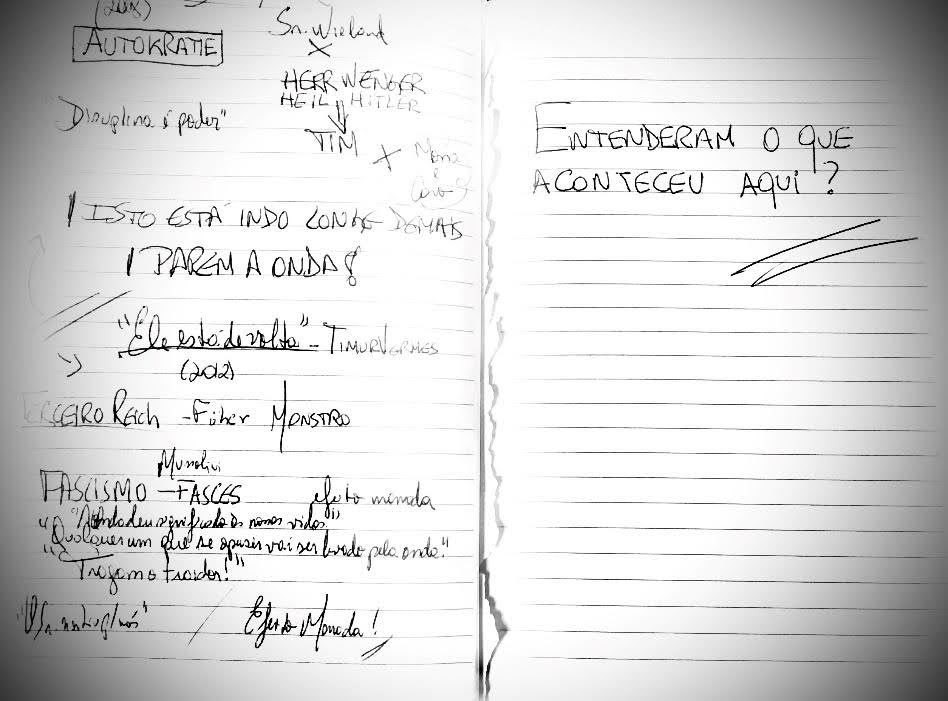 Dia vinte e quatro de outubro de dois mil e dezoito. José faz anotações em um de seus cadernos — hábito que jamais abandonou —, a apenas quatro dias do segundo turno de uma das mais angustiantes eleições presidenciais de seu difícil país. Nota-se, pelo tom que ele emprega, que escrever é uma tábua de salvação. Outro professor escreve na lousa “AUTOKRATIE”. O entediante Sr. Wieland ficou com as aulas sobre anarquia. Rainer, a contragosto, falará sobre autocracia. Trata-se de um projeto de uma semana, a duração do filme dirigido por Dennis Gansel, cujos capítulos se estendem de segunda a sábado. Apesar da empatia pelo docente, rever o nazismo é um lugar-comum desanimador para a maioria dos alunos de Rainer. Eles ganham um intervalo de dez minutos. Assim que retornam, o professor coloca em prática uma nova ideia. Agora, ele é o líder de um grupo e deve ser chamado por Herr (“Senhor”) seguido pelo sobrenome: Herr Wenger. Os alunos devem se sentar corretamente nas carteiras, dar respostas curtas e diretas, e se levantar antes de falar. Aos poucos, após um breve estranhamento, o discurso enérgico torna-se cativante. Exceção aberta às amigas Mona e Karo, todos estão empolgados. Unidos, sentem-se invencíveis. “Disciplina é poder”. Os jovens contam a experiência aos pais, que, no entanto, torcem o nariz para o relato. Para dirimir as diferenças entre si, os estudantes adotam camisas brancas como uniforme e passam a agir colaborativamente. O grupo escolhe um nome, cria um logotipo, constrói uma página na internet e adota uma saudação. Terá José sentido a mesma faísca elétrica que me queimou quando assisti ao eletrizante A Onda (2008), de Dennis Gansel? Suas anotações não transparecem isso.