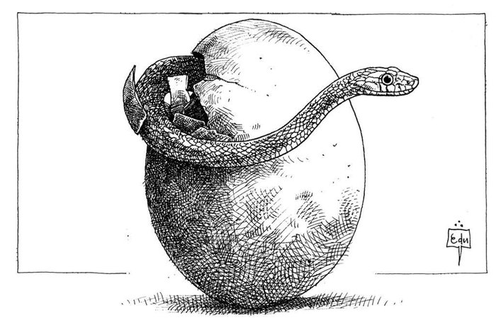 Quando todos já voltavam aos seus quartos com seus Iphones na mão, o primeiro ovo se quebrou. De dentro, em vez de um passarinho, saiu uma enorme serpente, que foi engolindo um a um. Primeiro, ela arrancava a cabeça. E cuspia fora, fazendo cara de nojo. Depois, devorava os membros: primeiro os braços, que engolia quase inteiros, como petiscos e depois as pernas, triturando fêmur, tíbia e fíbula, e deixando a patela por último, como a cereja do bolo. Mas o prazer maior advinha do tronco. Rasgava as vísceras com um deleite infinito, apreciando o sabor de fundo, talvez o único resquício de humanidade perdido… Não sobrou ninguém. Apenas Neuza, que, ainda rezando, seguiu com a serpente para outro condomínio. Como deveria ser…