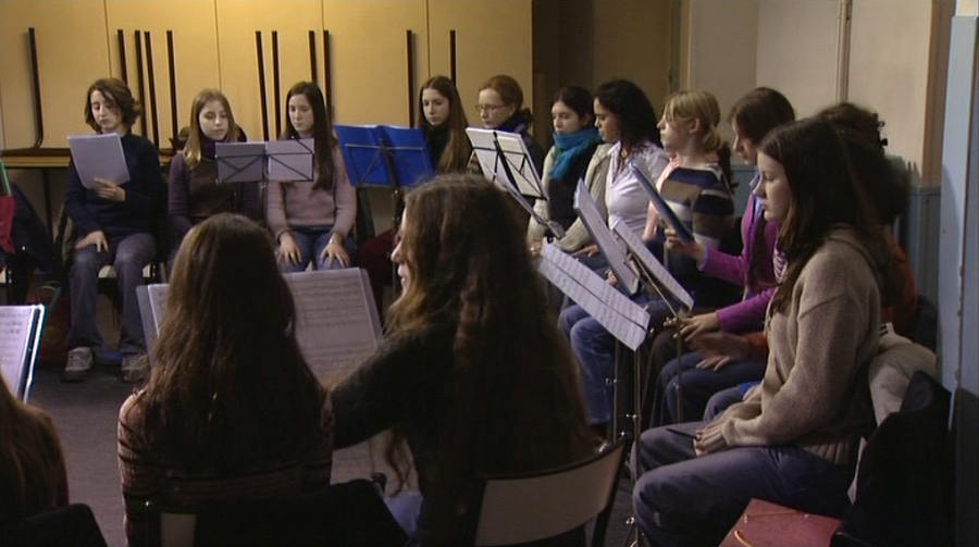 Bobos seríamos também se deixássemos passar a radical simplicidade do dispositivo do documentário Les Métamorphoses du choeur de Marie-Claude Treilhou, totalmente composto por registros de ensaios de um coral. O espanto vem somente após um tempo, frente à extraordinária variedade de fisionomias e jeitos dos membros do que nos dizem ser um Conservatório de música, aparentemente vindos de todas as camadas da sociedade. Mas aqui também a etnografia fácil é combatida graças às tomadas de partido formais da realizadora. As panorâmicas que descrevem pacientemente os diferentes grupos de cantores (ou “elementos de coro”) aproximam-lhes os rostos uns dos outros enquanto também circunscrevem a área comum onde eles deverão coexistir em harmonia. E sobretudo, sempre que possível, cada corista é enquadrado da cintura pra cima a fim de melhor resolver a oposição entre a origem das vozes angelicais (o peito) e as caras de quem não está em ação, o diferencial a ajustar-se entre o fôlego e o canto. O filme adquire então um clima de reportagem sobre uma seita estranha — os mestres da música sucedendo aos Mestres loucos? —, particularmente com os exercícios lúdicos propostos às criancinhas a fim de que tomem consciência de sua respiração e possam controlá-la. Ora se o fôlego é um “aquém” do canto, a parte que vai além é a palavra, que ressoa pela primeira vez quando a capitã do coral explica a seus pupilos o texto da obra, sem saber-lhe o significado eles não poderiam dar uma interpretação satisfatória. Sendo um filme sobre a arte, é do tipo que consagra integralmente sua duração à busca obstinada do elo justo entre a voz, o canto e o sentido: a matéria, a obra e a ideia.