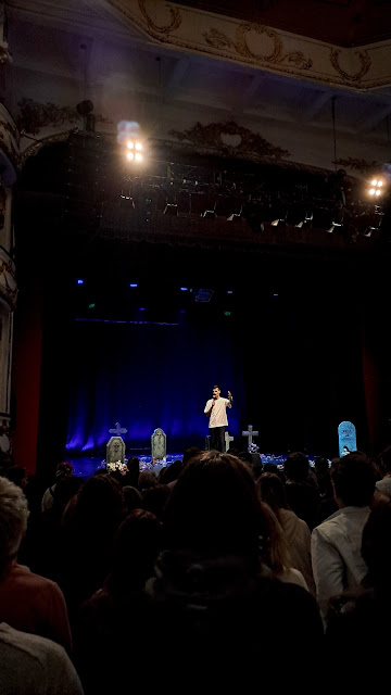 Foi a primeira vez que o vi a atuar ao vivo e, primeiro, deixem-me só partilhar o meu espanto quando o vi a entrar em palco, porque eu sei que o Raminhos é alto, mas não estava preparada para o quão alto ele é. Segundo, e focando-me naquilo que importa, quero apenas dizer-vos que adorei a cadência do espetáculo, a maneira como encaixou todos os assuntos, garantindo que «o seu habitual humor nonsense» tinha propósito e que trazia um dialeto transversal à plateia. Na sala do Sá da Bandeira estavam pessoas muito diferentes, que podiam não se rever em determinadas crenças e, mesmo assim, sinto que abraçamos cada pedaço das suas histórias de peito aberto, disponíveis para, pelo menos, tentarmos compreender a origem daqueles pensamentos e/ou daquelas atitudes. Houve muita vulnerabilidade e franqueza na partilha e isso conquistou-nos.