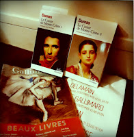 Estando a oferta cuidadosamente dividida - young adult, não-ficção, policiais, literatura geograficamente dividida, literatura em inglês numa prateleira mais abaixo (mas, ainda assim, visível) e até mesmo catálogos de exposições de arte -, dirigi-me, pois claro, à literatura francesa, letra D, de Dumas - a minha última compra planeada era Le Comte de Monte-Cristo. Por terras francesas, é hábito comum editar livros maiores em vários volumes (embora, ao contrário de Portugal, cada volume custe 8€, e não 15-20€); encontrei o Tome 1, e pedi ajuda para encontrar o Tome 2, que, infelizmente, não estava disponível. Mas j'aurai beaucoup du temps pour trouver le 2ème, disse eu à muito prestável funcionária, que se ajoelhou e tirou livros em busca do segundo (que não havia, portanto comprei na FNAC mais tarde, no mesmo dia, mas isso não arruína a foto em que apresento os dois - certo?).