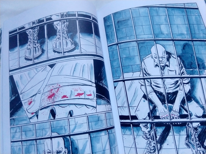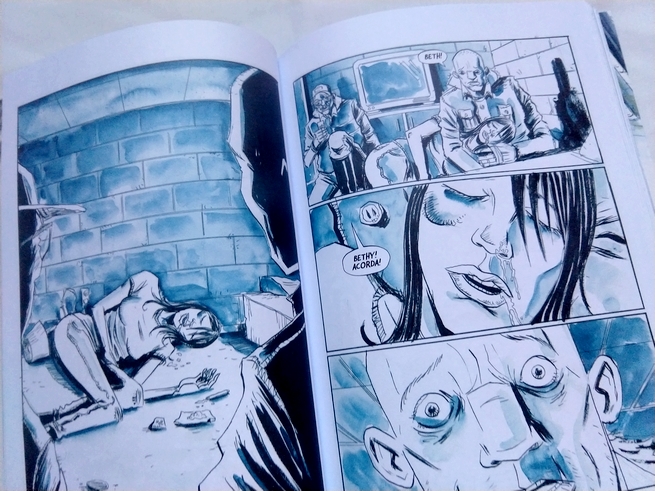 Jeff Lemire fala de assuntos muito importantes nesse livro, como abuso, drogas, miséria e todo tipo de sentimento ruim que nós, seres humanos, sentimos. O azul também representa essa inveja, raiva, vontade de de se vingar que está dentro dos personagens. Aqui, a cor só aparece nas raras vezes em que o autor mostra cenas do passado de Derek e Bethy. Eles tinham um pai muito violento, que batia na esposa, então já podem imaginar que nenhum dos dois teve uma vida fácil.