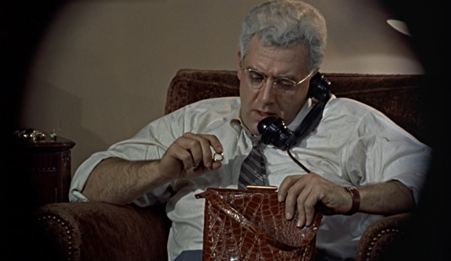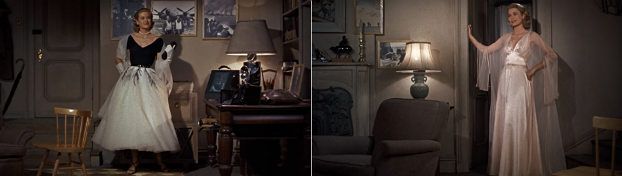 Ao longo do filme, os vestidos sofisticados de Lisa lhe dão a aparência de uma presença alheia ao ambiente de Jeff, mais estranha e maravilhosa que as várias maravilhas exóticas que ele encontrava em suas viagens - uma singularidade fascinante e ameaçadora ao mesmo tempo. A ameaça se torna especialmente evidente na sequência em que Lisa age ostensivamente de acordo com seu desejo por Jeff e acaba por passar a noite com ele. Significativamente, é a noite em que ela se convence da culpa de Thorwald. Jeff acabara de observar Thorwald falando ao telefone e examinando algumas jóias, que incluem uma aliança, na bolsa de sua esposa. Nos filmes de Hitchcock, bolsas femininas (e suas jóias) tomam uma significância corriqueiramente Freudiana em relação à sexualidade feminina e às tentativas dos homens em investigá-la. É possível pensar, por exemplo, na bolsa do close-up que abre Marnie, que contém as carteiras de "identidade" de Marnie e o butim de seu assalto ao patriarcado. Em Janela Indiscreta, Lisa conclui que a Sra. Thorwald com certeza foi assassinada em vez de, como Tom Doyle acredita, despachada numa viagem, pois mulher alguma deixaria para trás sua bolsa favorita (para não falar de sua aliança). Enquanto reflete, Lisa apanha sua própria bolsa de estilista, que descobrimos ser uma espécie de bolsa "trucada"; é na realidade uma pequena maleta, e numa de suas muitas linhas de diálogo que soam como innuendos sexuais (este involuntariamente ecoando a noção Freudiana de sexualidade masculina e feminina, mas revertendo seus valores, sendo que toma o último como padrão), ela diz, "Aposto que a sua não é tão pequena." Quando abre a bolsa, um caro e elaborado négligée escorrega para fora, junto com um par de encantadoras pantufas. A bolsa conecta Lisa com a mulher vitimizada, assim como o négligée, já que a inválida Sra. Thorwald sempre era vista usando camisola; mas também, significativamente, conecta-a ao criminoso, Lars Thorwald, e assim é uma imagem sobredeterminada, como as imagens do trabalho freudiano dos sonhos. Assim, quando Tom Doyle volta ao apartamento de Jeff à noite, ele continua a lançar olhares significativos para a camisola, como se esta fosse um objeto incriminador; quando Jeff questiona por que Thorwald não contou ao senhorio para onde ia, Doyle olha para a maleta e pergunta sugestivamente, "Você conta tudo ao seu senhorio?". Depois de Doyle ir embora, Lisa recolhe a maleta, oferecendo a Jeff uma "prévia das próximas atrações", e enquanto vai ao banheiro se trocar, pergunta, "Acha que o Sr. Doyle pensou que roubei esta bolsa?".