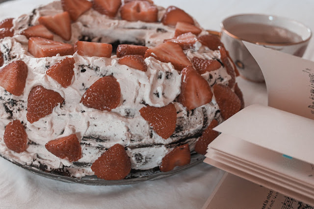 Morangos foi o ingrediente escolhido para o mês de maio, no projeto Páginas Salteadas. Portanto, partindo do livro de Charlie Mackesy, no qual existe uma personagem bastante gulosa, decidi fazer o bolo da cuca, recheando-o - e cobrindo-o - com morangos e natas. Vejam aqui.