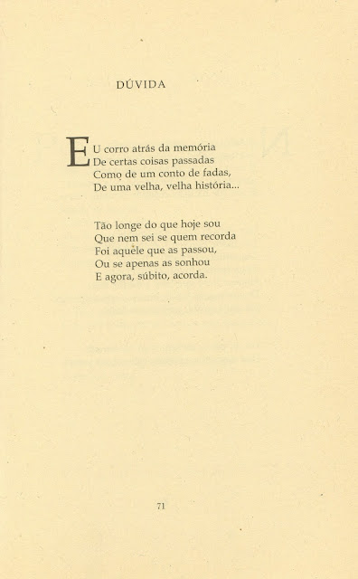 O poema desta semana pertence a Canções de entre Céu e Terra (1940). A imagem foi obtida a partir de Poesia (1998), volume organizado por Luis Manuel Gaspar, João Filipe Bugalho, Maria Jorge, Luís Amaro e Diana Pimentel. Prefaciado por Joana Morais Varela, publicado pela Editora LG, com ilustrações de Luis Manuel Gaspar, vasta iconografia, cronologia, tábua de variantes, extractos de correspondência e minuciosa bibliografia, Poesia é, pelo esmero gráfico e rigor bibliográfico, o livro com que sonham todos os poetas.