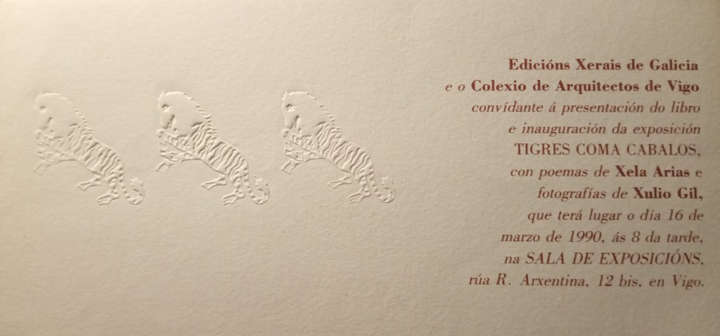 Conservo, dunha maneira un tanto casual pois non adoito gardar este tipo de documentos, a tarxeta do convite á inauguración da exposición que serviu tamén para presentar o libro nun acto que organizara Edicións Xerais e que recordo como memorable. A tarxeta goza dun tratamento non habitual pois foi editada nun papel de gramado especial cunha textura rugosa á esquerda onde se pode observar un deseño de tres trigres, en efecto, coma cabalos.
