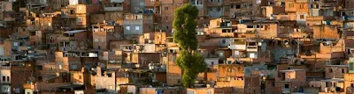 A cena inicial sintetiza bem o espírito do filme. A câmera parada mostra um punhado de casas da favela e uma grande árvore no meio (foto do início do post). Abre um pouco o enquadramento, há mais casas ainda. Diminui mais uma vez o zoom, a árvore está lá no meio, minúscula, e há infinitas casas. A favela engoliu a cidade, é um gigante que não pode mais ser controlado.