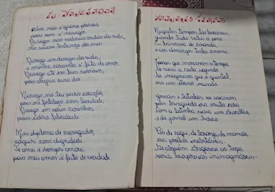 — Ela tinha a caligrafia diferente, toda trabalhada, então, apaixonado por ela, comecei a copiar a caligrafia dela e, como ela escrevia poesias, eu passei a me interessar por poemas, daquelas trovinhas de amor do tipo “O beijo dado no rosto/ rola, rola, cai no chão./ O beijo dado na boca/ vai parar no coração” – diz o poeta, hoje com 43 anos, 4 livros publicados de forma independente, que ainda guarda o caderno de poesias da pré-adolescência, como podemos ver nesta reprodução: