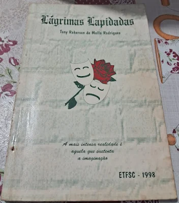 Foi a melhor decisão da minha vida, porque, desde que entrei em 1996 na ETFSC de Florianópolis até 1999, quando concluí o curso Técnico em Eletrônica, eu escrevi para o jornal da ETFSC (comandado na época pelo professor Alcides Vieira), escrevi peça de teatro para o grupo teatral Boca de Siri encenar (inclusive o crítico de arte e professor Osmar Pisani, na época, fez parte da encenação dessa pequena peça que escrevi e que era uma homenagem ao poeta Lindolf Bell), participei de (e ganhei) concursos literários da ETFSC, publiquei poemas meus numa antologia da ETFSC, na agenda da ETFSC (quando já era CEFETSC), e lancei em 1998, ano em que Saramago ganhou o Nobel em Literatura, meu primeiro livro, chamado Lágrimas Lapidadas, cuja capa reproduzo: